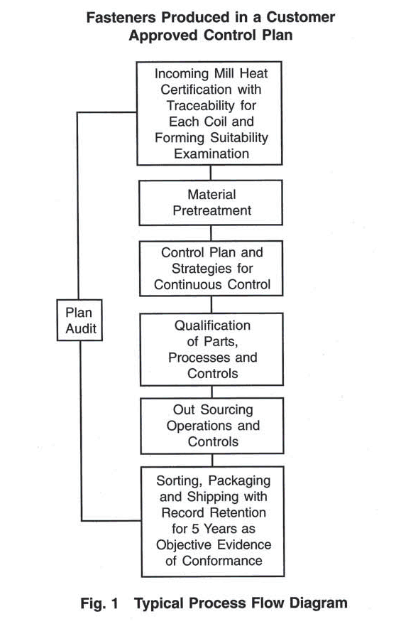This plan is based on the concept that a written control plan outlining the fastener manufacturing process and identification of its control points will provide an orderly procedure for controlling and minimizing process and product variation. Factors usually considered when developing a control plan include past history, machine capacity and capability, new or special customer requirement(s) and a PFMEA (potential failure mode and effects analysis). Typically the control plan identifies actions at each phase of the manufacturing process including receiving, in-process manufacturing, and outgoing operations. Continuing vs. periodic requirements are identified and strategies provided for continued updating and improvement.