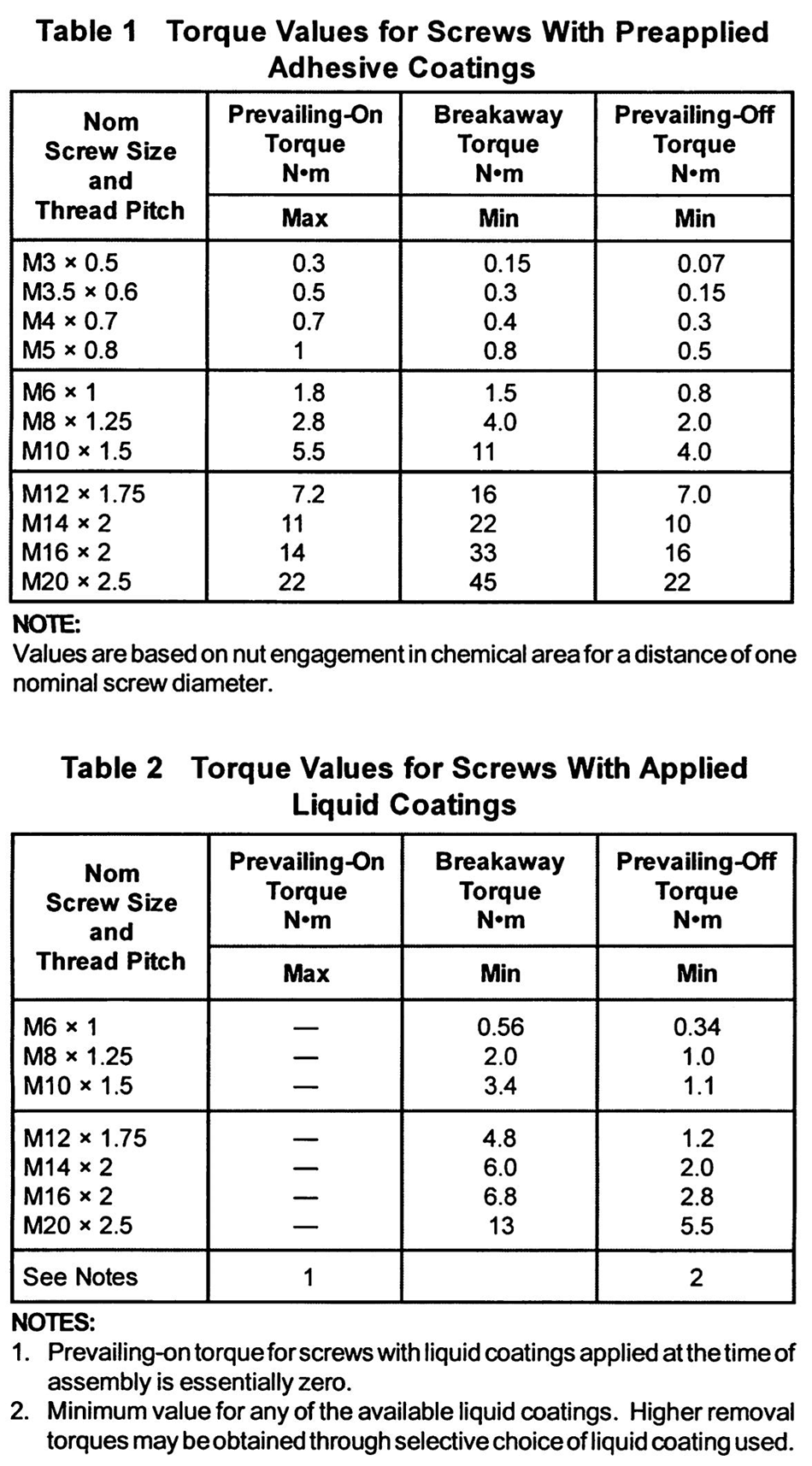 Torque values given in this standard are conformance requirements for adhesive coated prevailing-torque screws and apply only to the combination of test conditions described in the performance test procedure (Para. 5.1). If the conditions of the actual service application differ from those of Para. 5.1 (e.g., length of thread engagement, class of internal thread tolerance, different coating on screw or mating part) the torque values may differ. Such values can only be determined through testing the prevailing torque screw in its actual assembly.